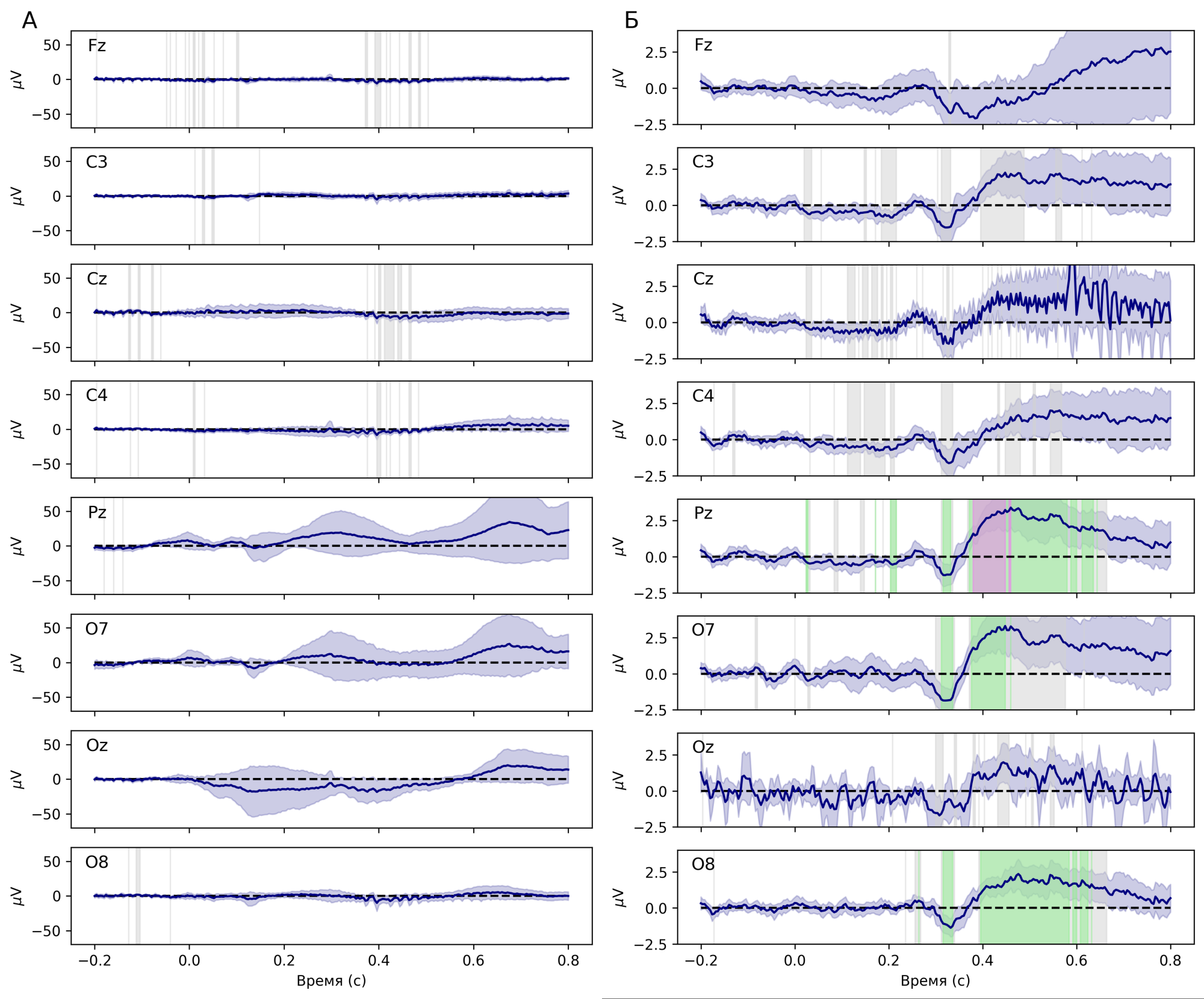 The difference between the evoked potentials for the target stimulus and the distractor, averaged across the group and across sessions without gel (A) and with gel (B). From here on, the blue lines represent the 95% confidence interval for the mean; the gray, green, and purple bars represent the difference in signal from 0 at p<0.05 (before FDR correction), p<0.05 (after FDR), and p<0.01 (after FDR)