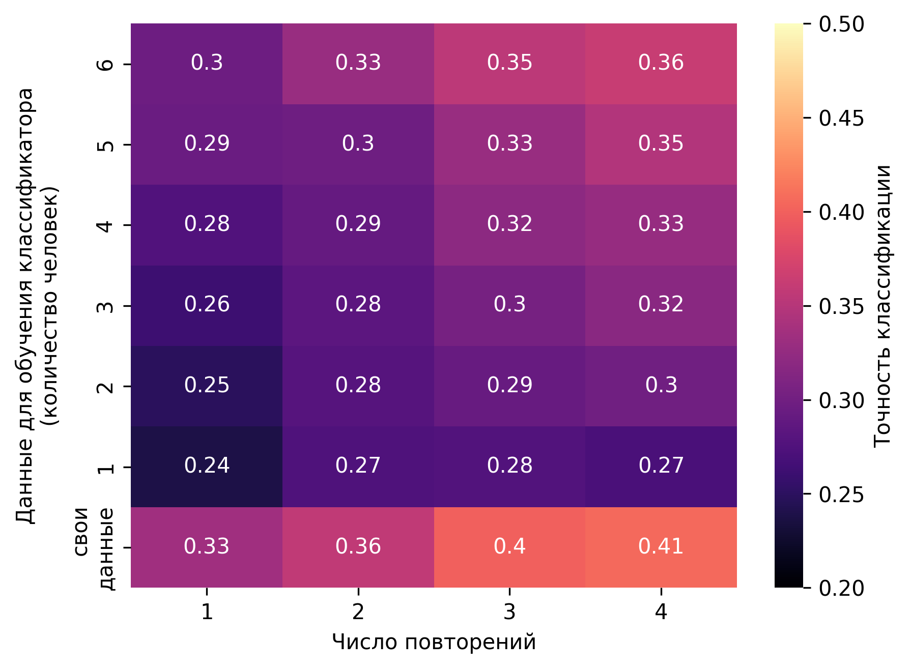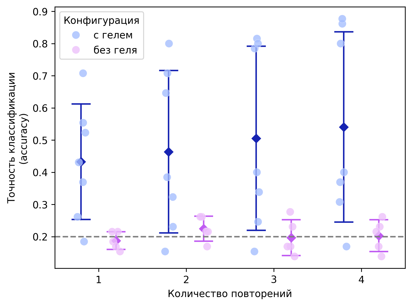 Data classification quality for different configurations depending on the number of stimulus repetitions. The graph shows the mean and standard deviation of classification quality