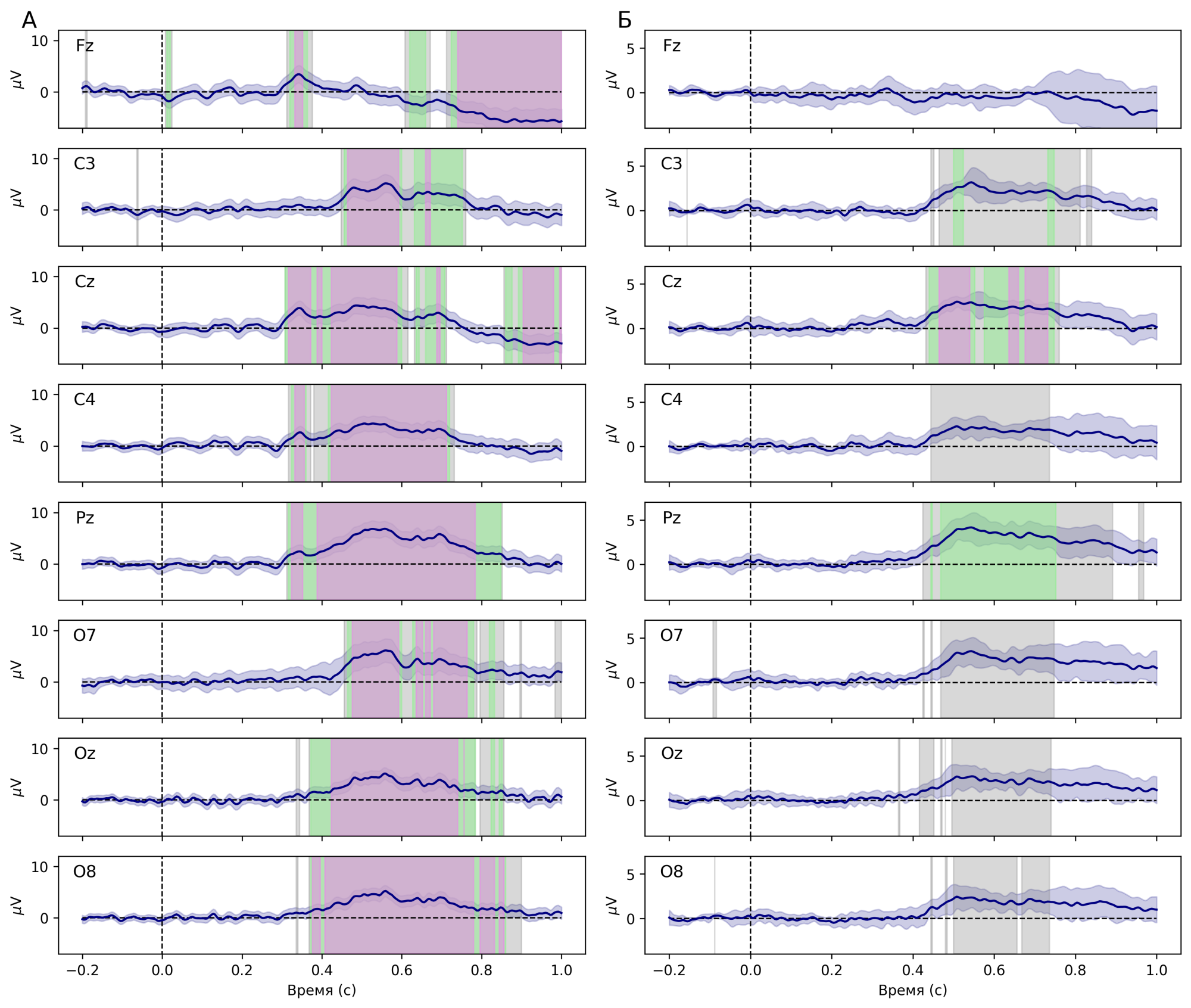 Разница между вызванными потенциалами для целевого стимула и дистрактора, усредненная по группе и по сессиям без геля (А) и с применением геля (Б). Здесь и далее синие линии отражают 95 % –доверительный интервал для среднего; серые, зеленые и фиолетовые полосы – отличие сигнала от 0 при p<0,05 (до поправки FDR), p < 0,05 (после FDR), p < 0,01 (после FDR)